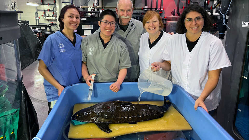 The Animal Health team monitors an armored catfish after surgery for a sinus infection before returning it to the Amazon Flooded Forest.