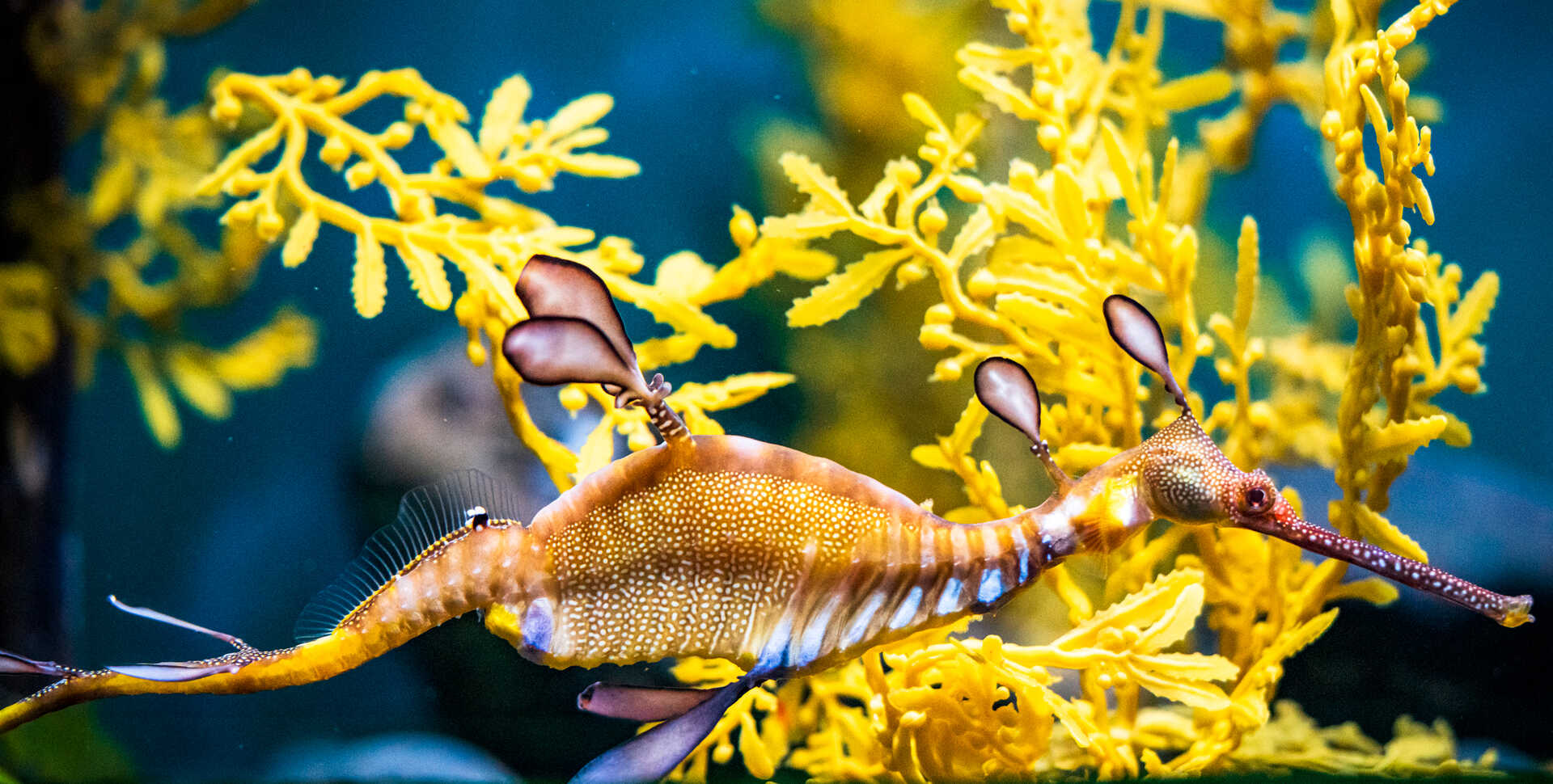 The fairy-tale beauty of these fragile fish serves an important purpose: Survival. Chic polka dots, striking “leaflets,” and an ombré palette help seadragons blend seamlessly into southern Australia’s seagrass beds and seaweed forests. Their bumbling swimming style completes this masterclass in camouflage: Drifting along with the current, they match the swaying movements of surrounding plant life.